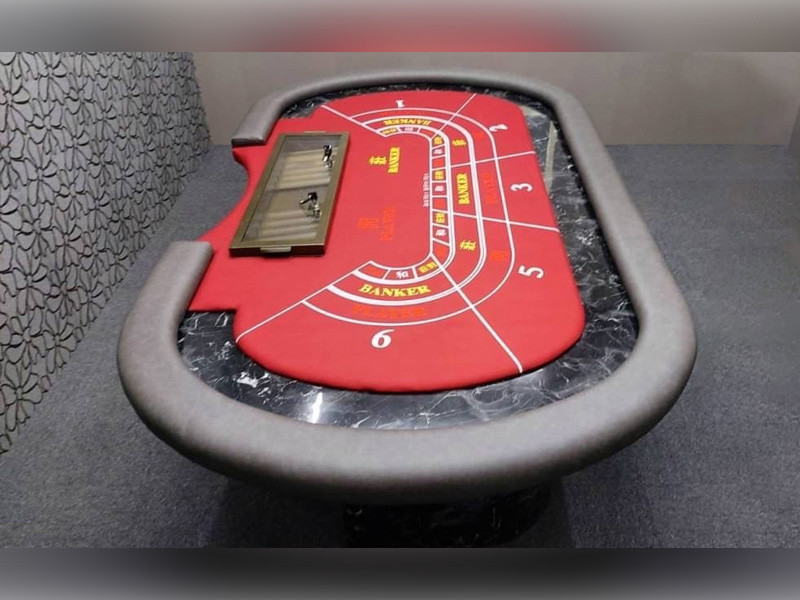 這款 小型百家樂桌 專為高端 VIP 空間所設計,桌面採用沉穩黑色大理石紋桌腳與尊貴紅色賭墊搭配,整體質感細膩、佈局精緻,是少人數包廂專用的首選款式。